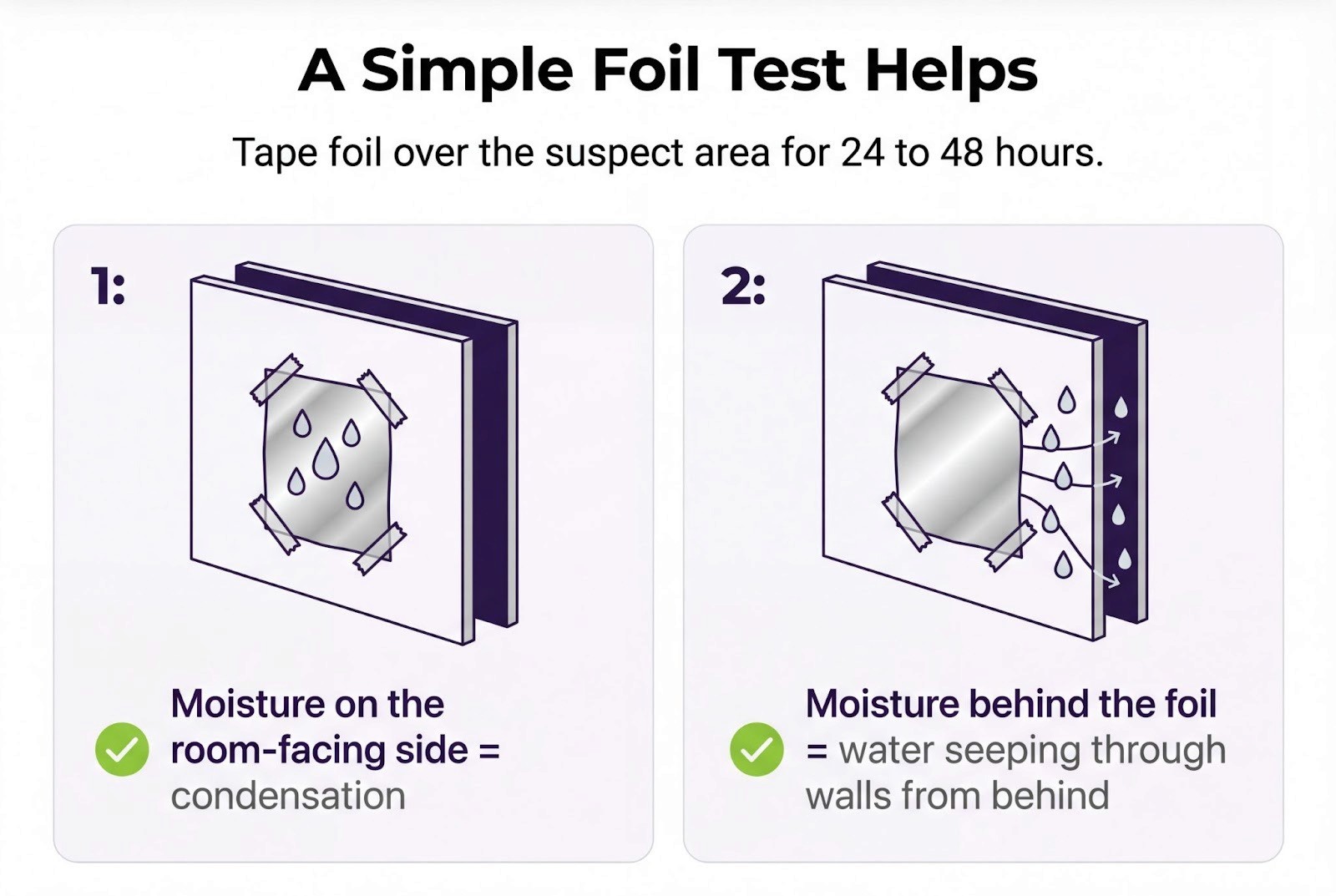 Condensation behaves differently from leaks. It forms evenly on cold surfaces and disappears with ventilation. Leaks create isolated patches that resist drying.