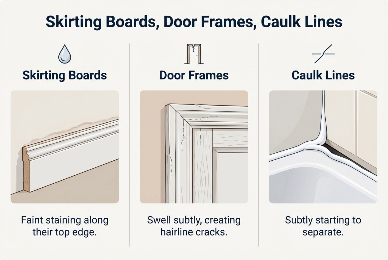 Door frames and architraves may swell subtly, creating hairline cracks or slight misalignment.